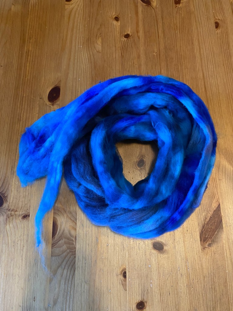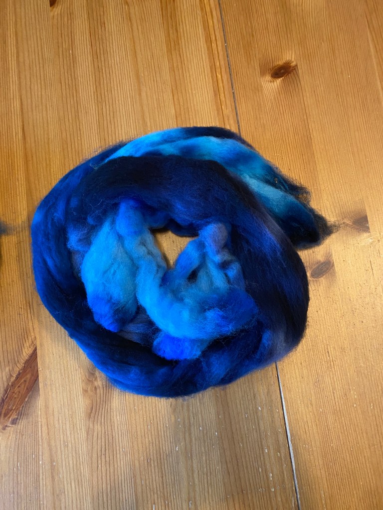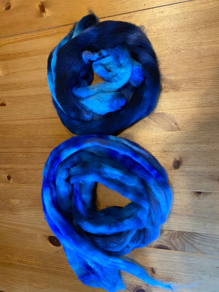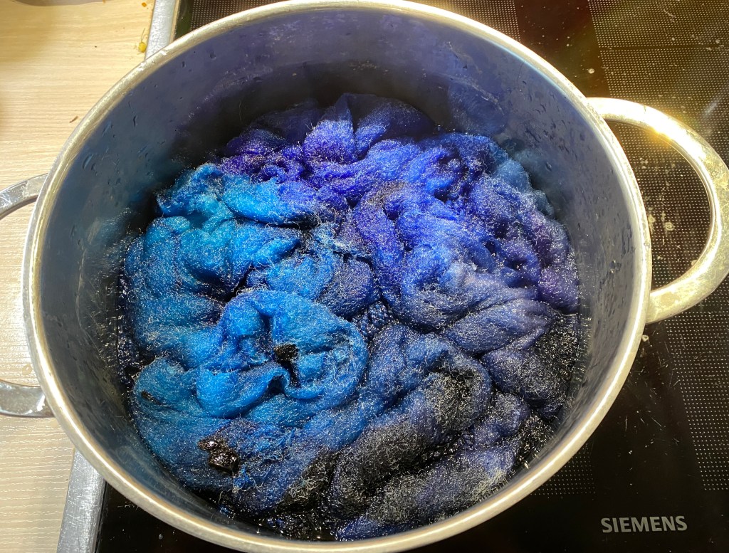 For dying this amount of fibre, acid dyes tend to be the most efficient choice. I used three different shades of blue and added the fibre for the Navajo plied yarn to the dye pot.
