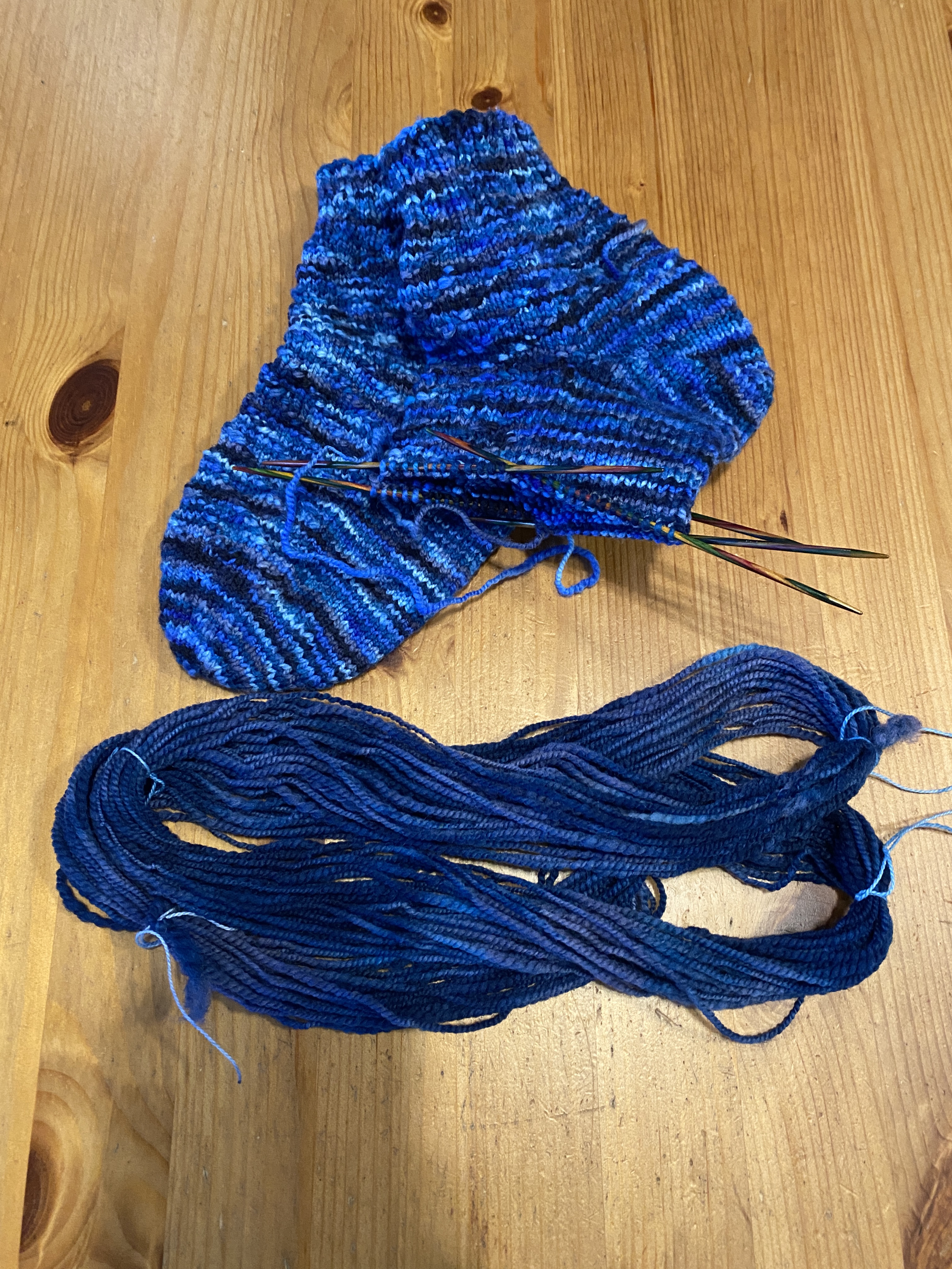 That mishap wasn’t the only complication. Half way through the second sock I ran out of yarn. Spinning knew was the only remedy. (And used up the remainder of my fibre.) I had only two blue dyes left, so I had to improvise a little.