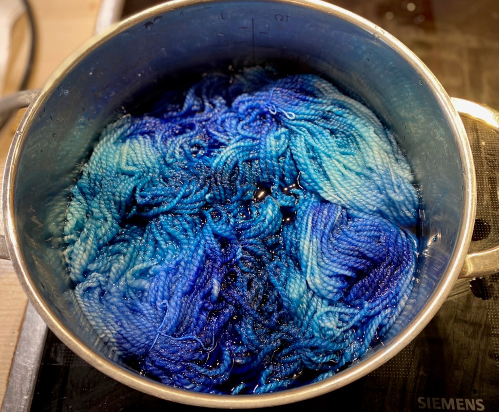 In keeping with the wave theme, I dyed the warp yarn navy blue and the weft yarn in two different shades of blue. The yarn looked great and promised an interesting project.