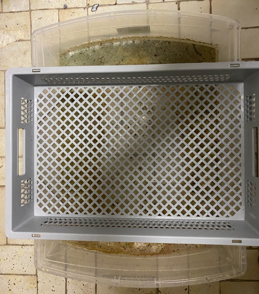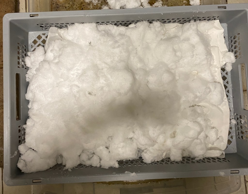 On day three the snow showed the first signs of melting, so I had to act if I didn’t want to miss my chance. By then I had come up with the brilliant idea of using one of the grid plastic boxes I use to store my wool. I have a basin to catch dripping water whenever I hang up washed projects to dry in the cellar. Those two items should prove a perfect combination for this experiment.