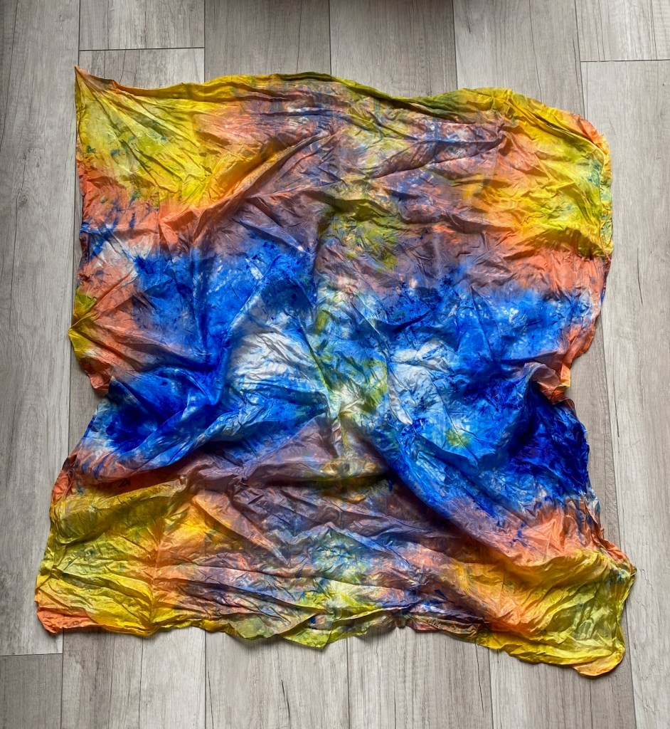 At first glance it seemed like not a lot had happened, the colours sitting side by side without blending together much. I got out my old steamer for baby bottles, which got little use for its intended purpose, but has proven invaluable in steaming fabric to set dye colours. I gave each sheet of silk two rounds in the steamer, unfolding them after the first one.