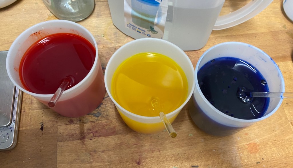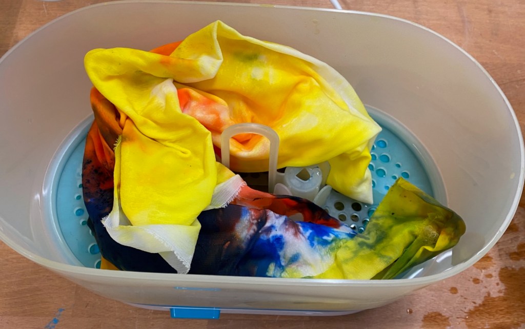 I got my Ashford dyes ready, improvising a little with the measurements as I had neglected to weigh the fabric beforehand. I picked simple red, yellow and blue hoping for a rainbow effect once the colours bled together.