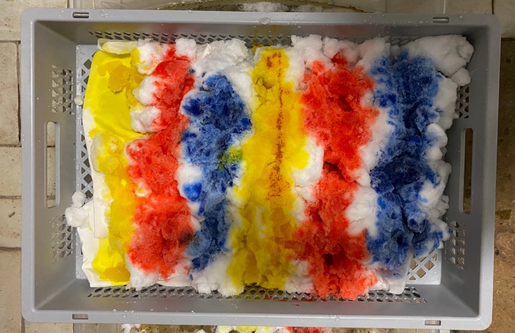 It was at this stage that I got to finally see the magic the melting snow had worked. While not quite rainbow-y, the colours had still bled into an interesting pattern. And I was a little surprised to see that both sheets had turned out completely differently. Both have a unique look to them and are truly one of a kind.