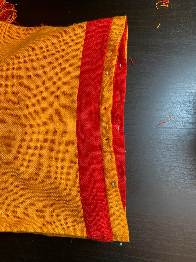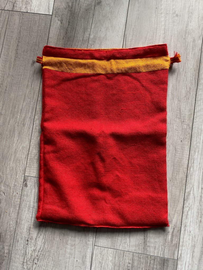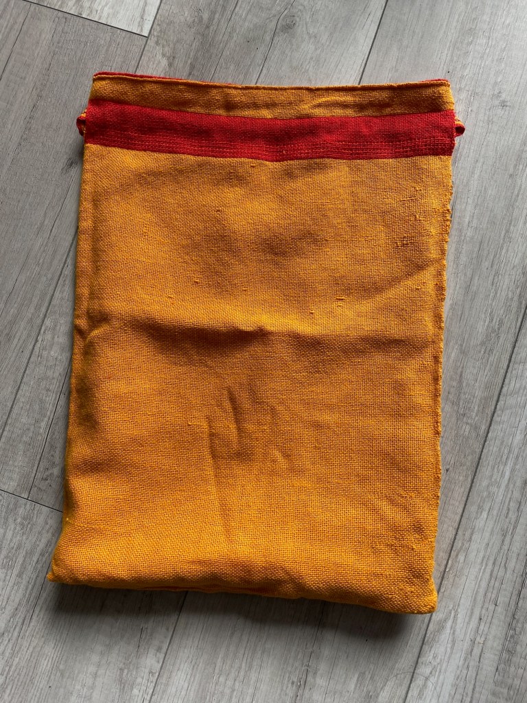 I had a set of reversible bags sitting around, that still needed the bottom closed and the rim sewn. I had initially started these for my kid to use at school for spare clothes and the like. But the material had been so fiddly that getting the warp on the loom was a nightmare, and weaving took a lot longer than anticipated.