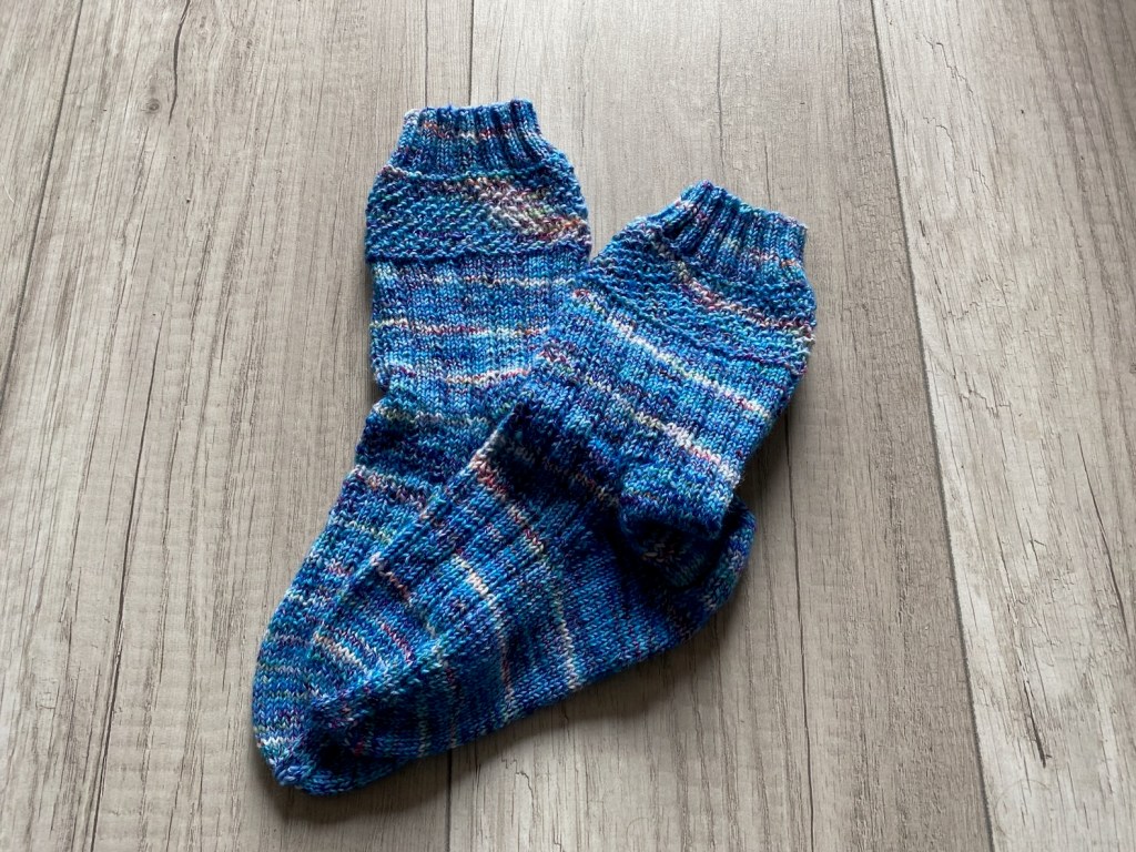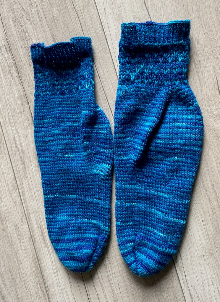 Das Endergebnis war brauchbar. Allerdings war die Maschenzahl für einen kleineren Socken berechnet worden und dadurch war das Bündchen ziemlich eng. Ich musste Extramaschen einfügen damit der Rand beim Abketten nicht zu eng wurde.