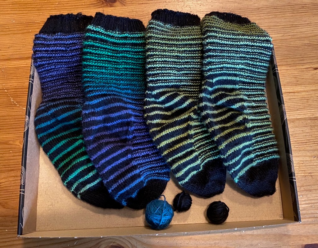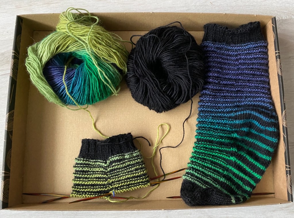 Ich sah mir das verbliebene Garn an und beschloss mit der Außenseite des Knäuels anfangend noch eine Socken zu stricken. Dies ergab einen weiteren gelb-grünen Socken. Aus dem Rest konnte ich dann einen weiteren zaubern der den Farbverlauf des ersten in umgekehrter Reihenfolge zeigte.