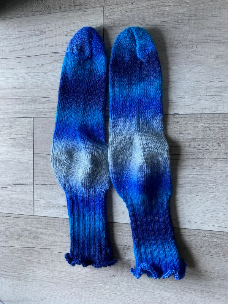 Der erste fertige Socken hatte einen interessanten Farbverlauf von blau nach grün. Ich strickte mit dem vorhandenen Garn weiter und bekam einen zweiten Socken in gelb-grün.